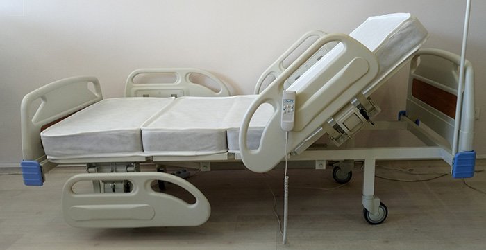 El kumandası ile hareketi sağlanan dual motorlu, elektrikli, tamamı ABS malzeme kaplı full abs hasta yatağı.Full ABS Hasta Karyolası Genel Özellikleri