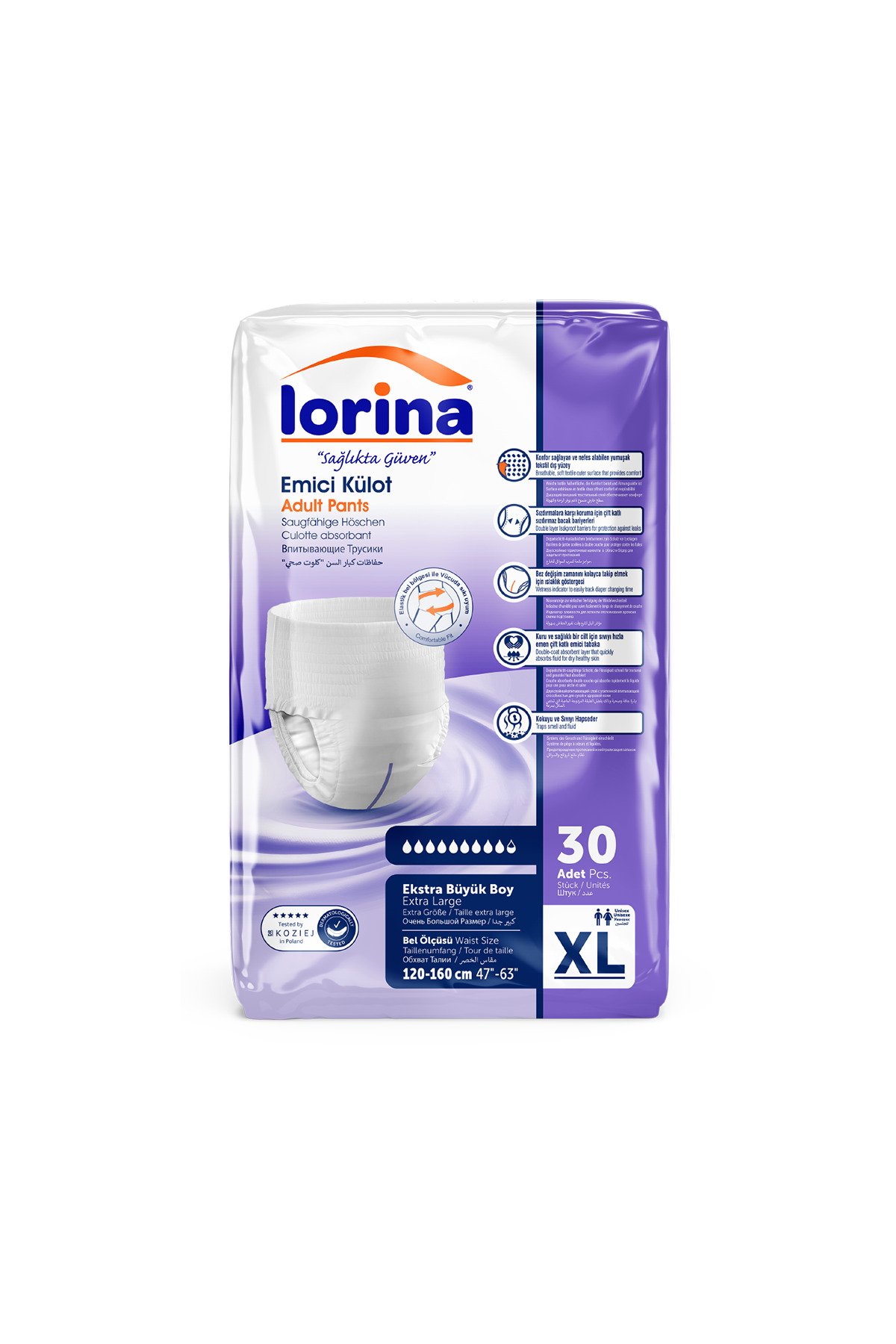 Lorina Emici Külot Xlarge, yüksek emiciliğe sahip, yetişkinlere yönelik olarak tasarlanmış bir külot bezidir. Özellikle orta ve yüksek seviyede idrar kaçırma sorunu yaşayan yetişkinler için günlük konfor ve güvenlik sunar. Bu paket, 30’lu setlerden oluşarak toplamda 120 adet ürünü içerir.