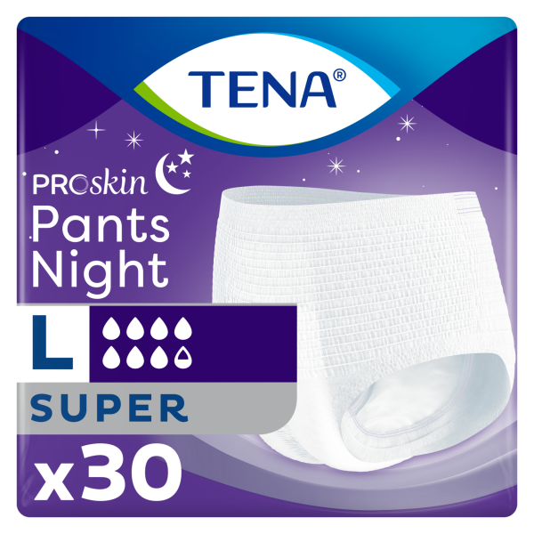 Beyaz, yumuşak ve rahat bir emici külot olan TENA ProSkin Pants Night, tıpkı sıradan iç çamaşırları gibi giyilebilir ve gece kullanıma uygundur.